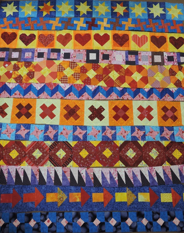 Auf dem nächsten Foto seht Ihr alle Streifen zusammen. Wir das nicht ein schön bunter Quilt?