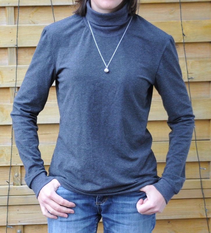 Ich habe mir das allererste mal ein Rollkragenshirt genäht. Mein altes (gekauftes) ist schon etliche Jahre alt und fing an, an den Ärmeln und am Hals Löcher zu bekommen. Da ich kein ähnliches mehr im Geschäft gefunden hatte, hab ich es jetzt mal selbst ausprobiert und bin sehr zufrieden mit dem Ergebnis.