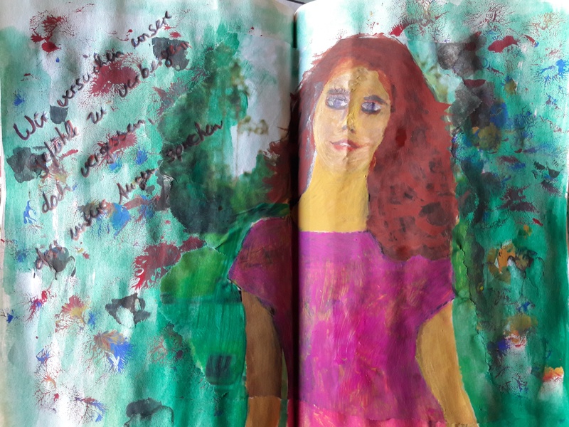 In diesem Monat ist das Thema bei Art Journal Journey 'ANYTHING with EYES' - "Alles mit Augen". Das Thema lädt ein, vom Menschen über das Tier bis hin zur Pflanze alles mit einzubeziehen. Im Englischen hat sogar die Nadel ein Auge. So gesehen muss ich mich fast, entschuldigen, dass ich diesen Monat so einfallslos bin und nur eine Seite in der Übermaltechnit gestaltet habe.