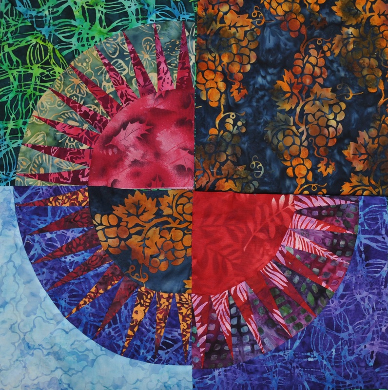 Leider habe ich vor dem Nähen, die Stoffe für alle drei Blöcke zugeschnitten, so dass ich jetzt drei äußere Teile übrig habe. Meine Idee ist es, mir einen eigenen Block zu entwerfen, für den diese Stoffe passen. So wäre der schöne Batikstoff nicht verloren.