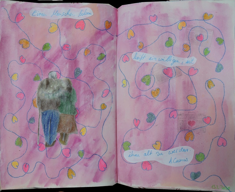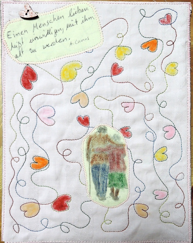 Wie im letzten Monat habe ich zuerst eine Journalseite in meinem Art Journal gestaltet. Wie Ihr vielleicht ahnt, habe ich dabei bereits ans Quilten gedacht. Zuerst habe ich den Hintergrund mit Wasserfarbe grundiert. Es waren auf der Rechten Seite schon ein paar Fotoapparate mit Herzen aufgestempelt. Da habe ich wohl mal den Stempel sauber gemacht..... Auf den Hintergrund habe ich dann die Herzgirlande gedoodelt. Die Herzen anschließend ausgemalt. Beides mit Gelstiften. Dann habe ich mir ein Zitat rausgesucht und mich für "Einen Menschen lieben heißt einwilligen, mit ihm alt zu werden. Dann habe ich das alte Ehepaar in schwarzweiß ausgedruckt, mit Bundstift coloriert und aufgeklebt.