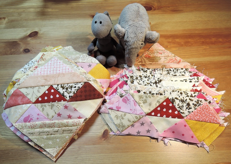Die gestreiften Dreiecke sind bereits seit langem vorbereitet und so muss ich auch jetzt nur die obere und untere Ecke annähen. Ich freu mich schon darauf die großen Quadrate zusammenzusetzen.