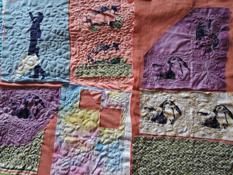 Ich selbst habe mir einige alte Siebdrucke vorgenommen und diese auf einen Hintergrund gequiltet. Ich dachte bei den Schafen an die Sehnsucht nach der Natur und einem heilen, friedlichen Leben. Die anderen Stoffstücke wollte ich in den nächsten Schritten an das Thema anpassen. Doch dabei ist es erst einmal geblieben. Vielleicht kann ich nächste Woche mehr zeigen.
