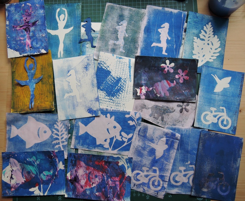 Ich habe im Postkartenformat gedruckt. Das scheint im Moment mein Lieblingsformat zu sein. Und so sind viele blaue Karten entstanden.