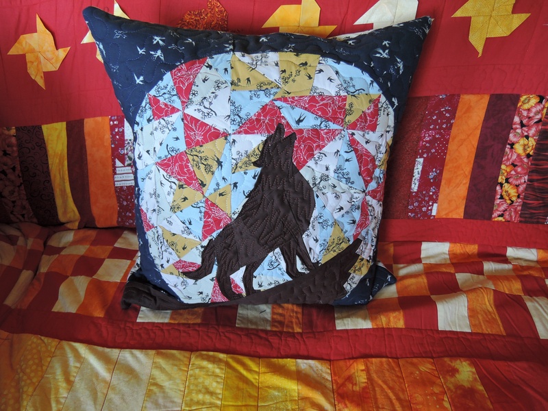 Gequiltet und fertig genäht habe ich in dieser Woche mein Wolfskissen.