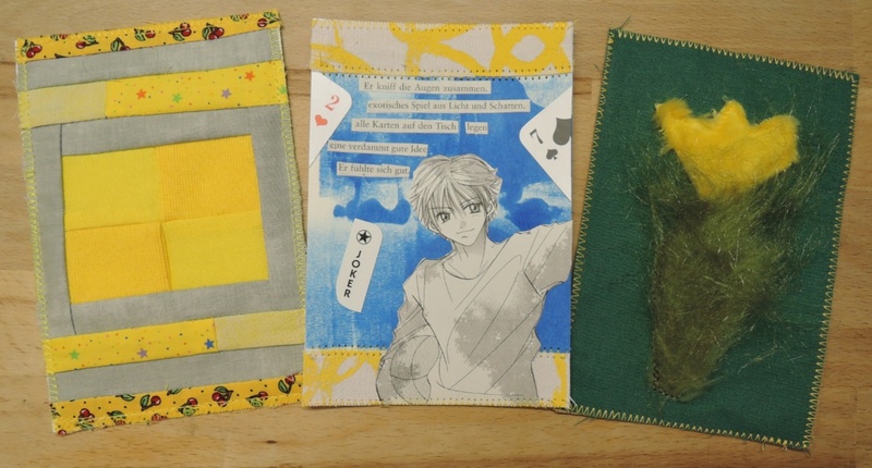 Nachdem ich meine Kleinstreste in der letzten Woche nach gelben Stoffen durchsucht hatte, schaute ich in dieser Woche in eine andere Box. Siehe da ich fand noch etwas mehr Gelb. Zusätzlich bekam ich gelben Jersey geschenkt. Auf der rechten Karte ist in der Mitte etwas Bündchenstoff mit verarbeitet. Während ich das Messer ansetzte, zweifelte ich jedoch etwas, ob ich dieser Stoff nicht vielleicht doch noch für ein Bündchen reichen würde. Deshalb blieb es bei den zwei Quadraten.