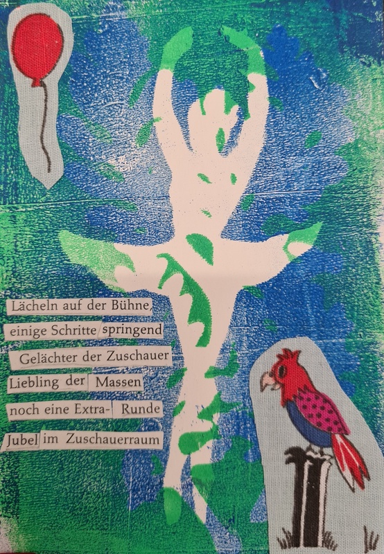 Beim Jahr der Miniaturen ist Halbzeit. Heute zeige ich Nummer 26. Wenig textil, eher im Stil meiner 100 Karten. Ein Jellydruck als Hintergrund zwei Stoffmotive aufgeklebt und  ein Text im poetryreduced Stil: