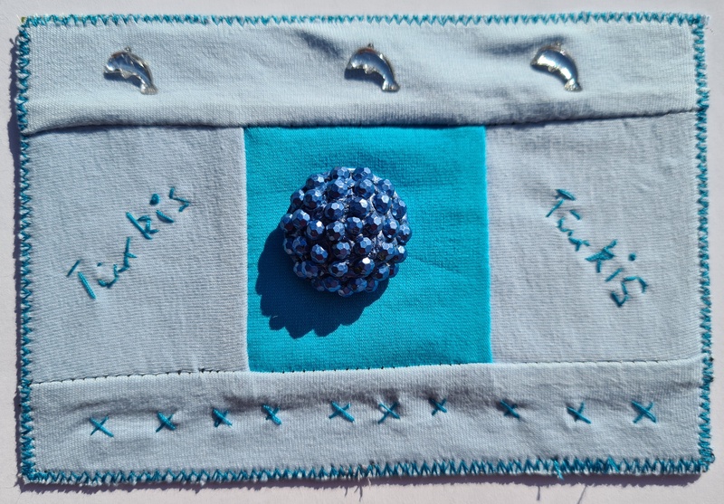 Die Karte entstand aus Jerseyresten. In der Mitte ein türkises Quadrat umrandet von hellblau. Den Knopf kaufte ich mal bei Knopfpaul aus der Grabbelkiste. Da mich die Farbe an ein türkises Meer erinnert, habe ich Delphine ergänzt. Eine kleine Spielerei.