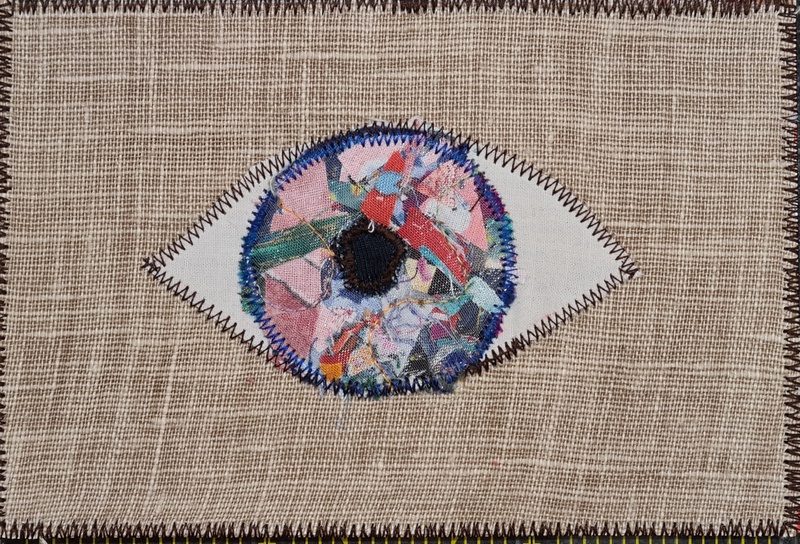 Etwas weißen Stoff auf Leinen genäht, darauf mit Schnipseltechnik die Iris und die schwarze Mitte aus Jersey. Da ist sie meine Augapfel-Miniatur für das Jahr der Miniaturen.