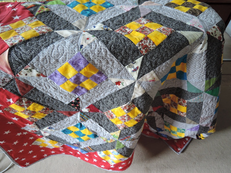 Das Top war bereits im Januar fertig, doch dann lag das Top einige Monate. Als Zwischenlage habe ich zwei alte Frotteebettücher genutzt. Somit ist der gesamte Quilt aus Baumwolle. Gequiltet habe ich in den grauen Flächen.
