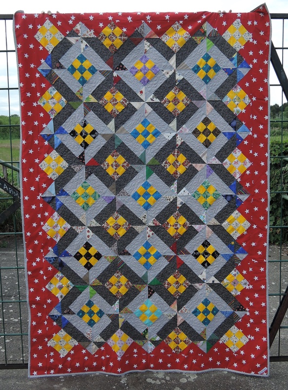 Zum Abschluss noch einmal das Foto vom fertigen Quilt. Es hat richtig viel Spaß gemach ihn zu nähen. Es ist eine tolle Anleitung. Ich habe mich nicht ganz an die Farbvorgaben gehalten, denn danach sollten die gelben Quadrate eigentlich weiß sein. Jetzt, da ich den Post schreibe, fällt mir auf, dass ich die Maße nicht weiß. Er ist ca. 140x210cm groß. Ihr könnt sehen, dass er recht groß ist, denn meine Hände sind oben am Tor gerade noch zu sehen und ich musste mich schon ganz schön strecken.