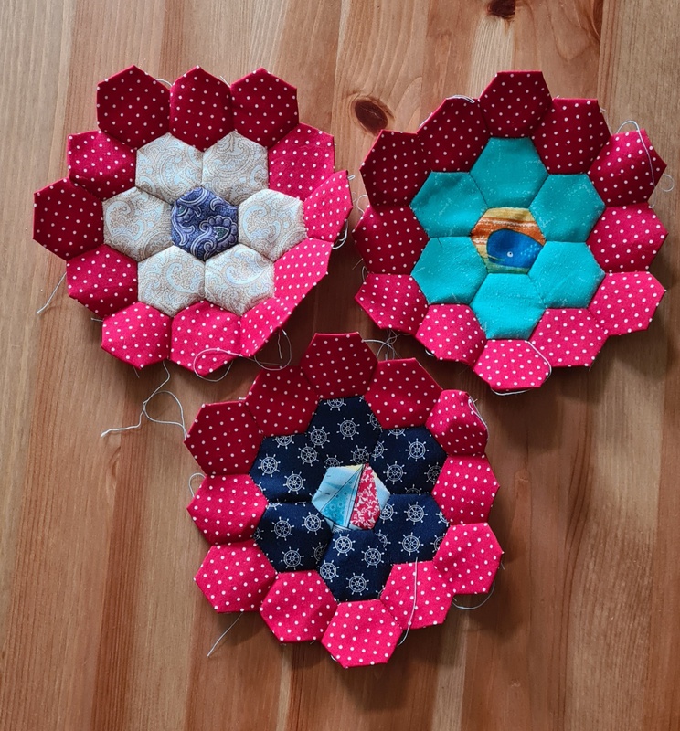 Drei weitere meiner Blüten wurden im letzten Monat mit roten Hexis umrundet. Die Motive passen doch gut zum warmen Wetter, was meint Ihr? Auf einem anderen Blog las ich, dass jemand 22 Blüten im Monat genäht hat. Ach wäre ich doch auch so schnell...
