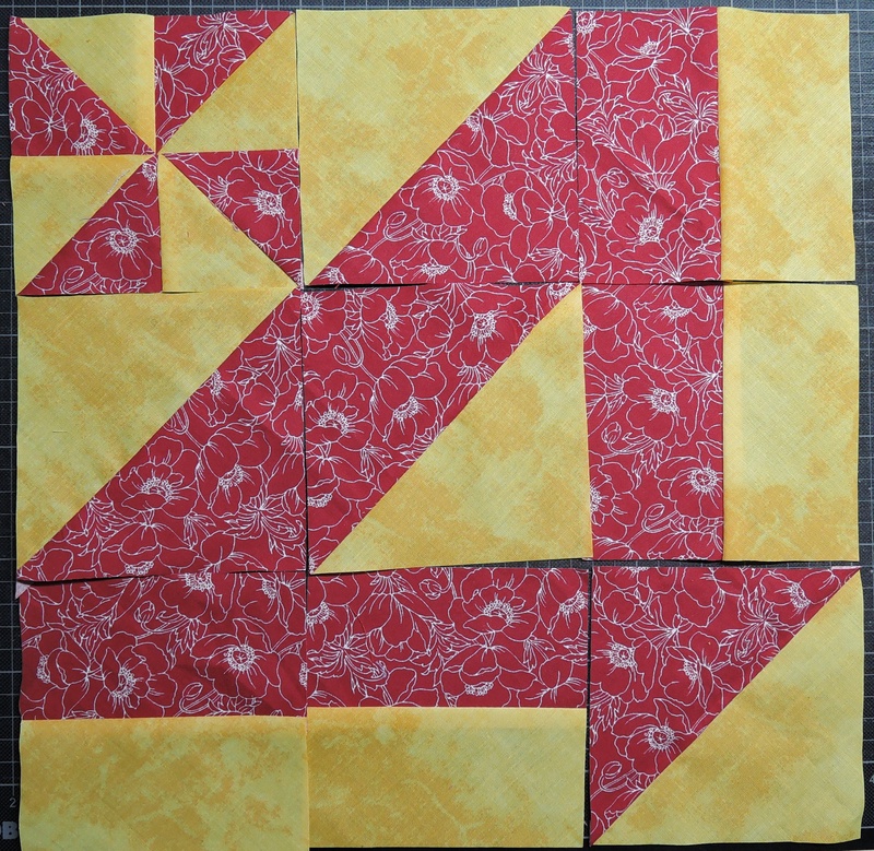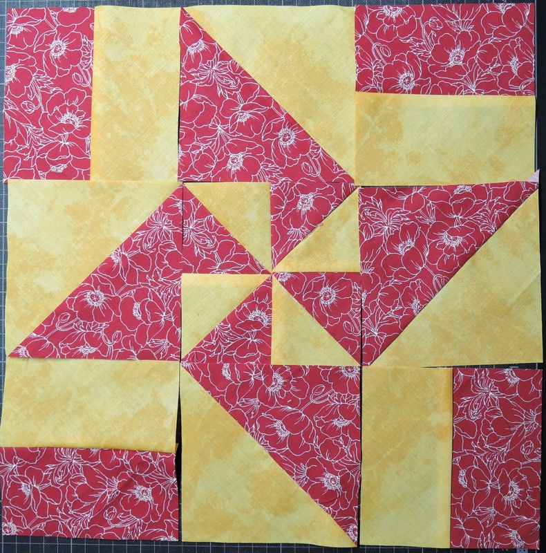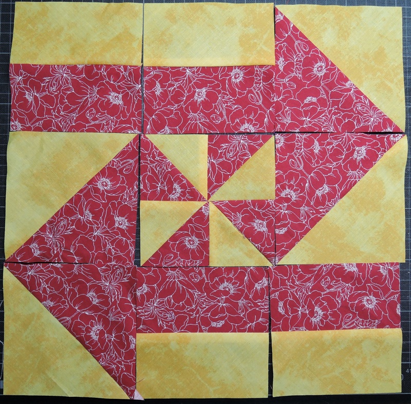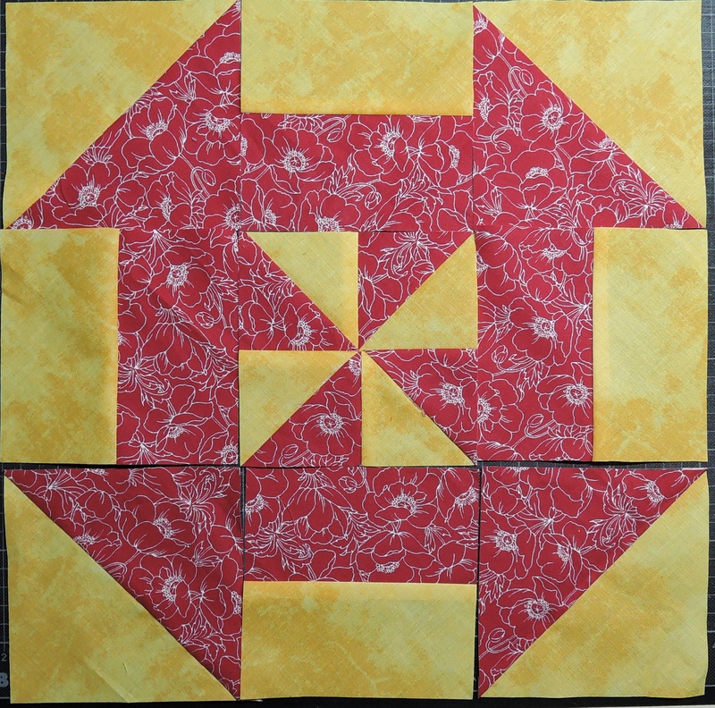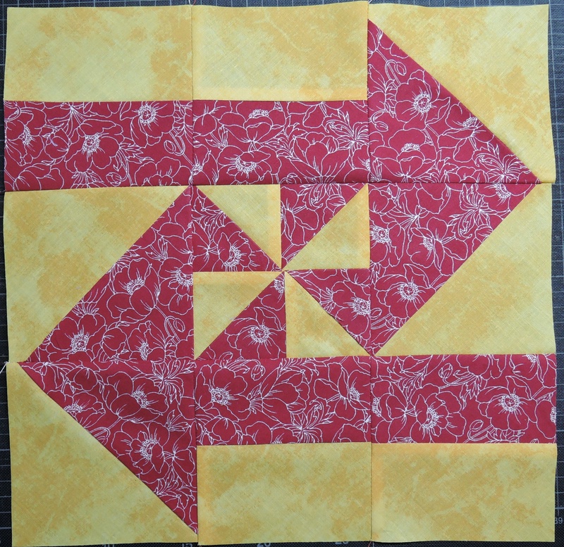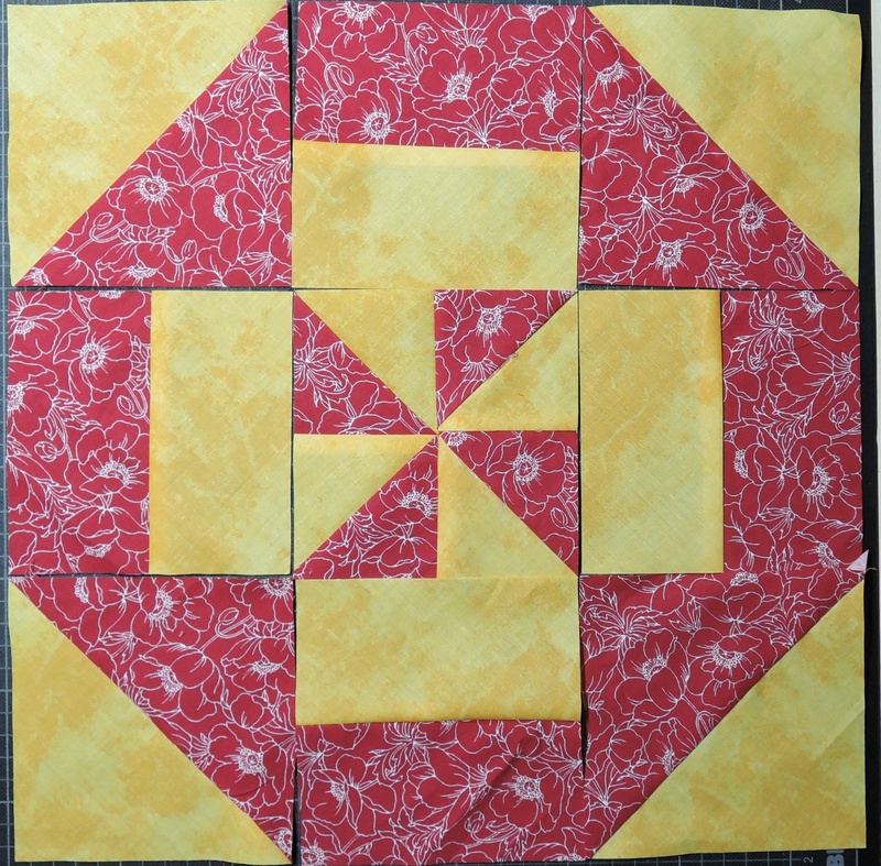Im Septemberheft 2022 der Gilde ist eine Anleitung zum Diappearing Pinwheel Block von Peggy Reinhold veröffentlicht. Das Foto des Blocks sprach mich beim ersten Durchblättern des Heftes an. Kurzerhand holte ich meine roten und gelben Stoffe aus dem Schrank und begann die Anleitung nachzuarbeiten.