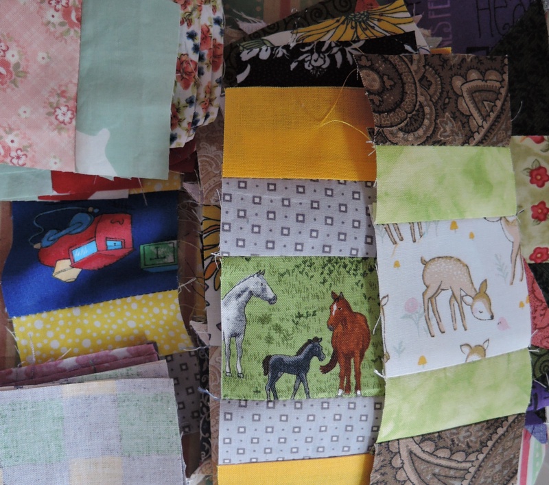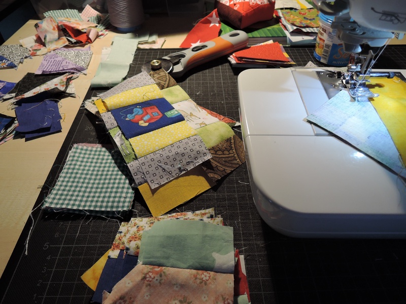 In die Mitte des Blocks kommt ein Motivstoff. Das Quadrat ist 6,5x6,5 cm groß. Ringsrum arbeite ich mit Resten. Die Anregung bekam ich über eine renommierte französisch/englische Patchworkzeitschrift. Dort war sie mit lauter Cowboys in der Mitte genäht.