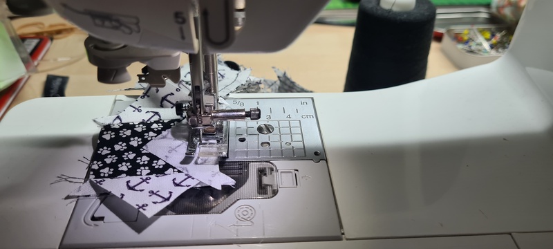Das erste ist ein "Storm at Sea". Vor einigen Jahren hatte ich mich schon mal an einem versucht. Doch da die Ecken der Rauten abgeschnitten waren, habe ich eine Tasche aus ihm genäht. Diesmal sind bei den ersten Quadraten die Nahtzugaben sehr knapp. Obwohl ich alle Teile so zugeschnitten habe, wie es in der Anleitung steht, habe ich nur noch 0,5 cm Nahtzugabe. Jetzt muss ich beim Zusammennähen extrem aufpassen, damit ich dieses Mal nicht den inneren Quadraten die Ecken abschneide.