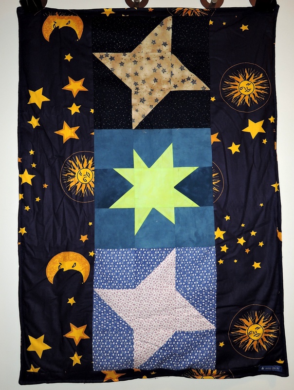 Die Sterne der unteren Decke sind Spendenblöcke. Mit dem Sonnen- und Mondstoff konnte ich sie zu einer Decke verarbeiten.
