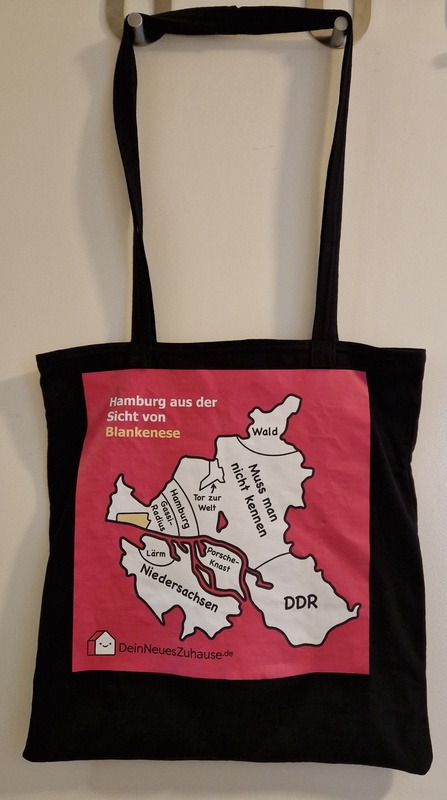Im Büro lagen einige Werbe-T-Shirts herum, die längere Zeit niemand mitgenommen hat. Der Werbeaufdruck ist ziemlich hart. Also habe ich sie mir gegriffen, um sie für dieses Projekt zu "missbrauchen". Jetzt kann der Beutel in der Mittagspause zum Einkaufen genutzt werden.