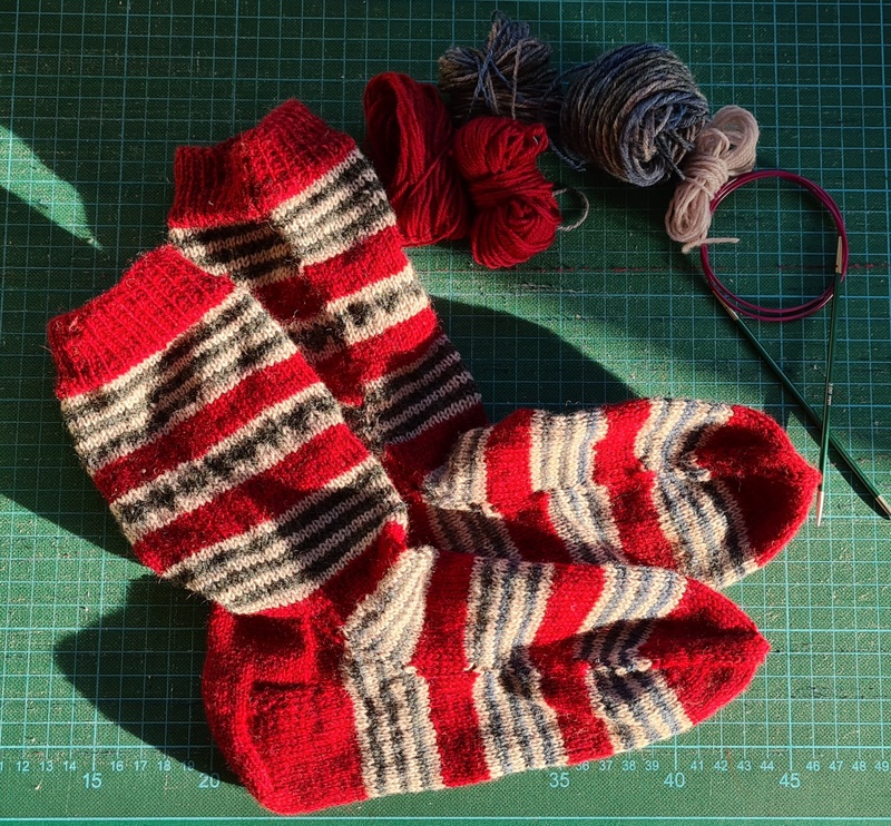 Diese Socken sind auch ein bisschen chaotisch geworden. Das Grau im Schaft ist keine Sockenwolle. Ja, wer legt denn Merinoreste in die Sockenbox? Nach der Ferse habe ich dann den Farbwechsel der einen Socke auf die andere Seite genommen. Warum war der Faden da eigentlich auf der anderen Seite? Somit sind die Übergänge bei beiden Socken am Fuß auf der gleichen Seite und nicht innen.
