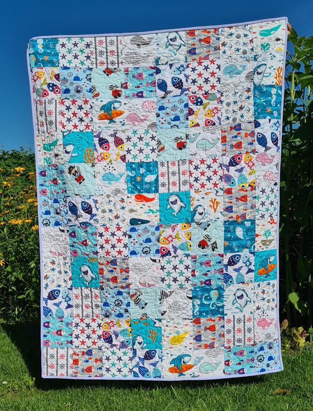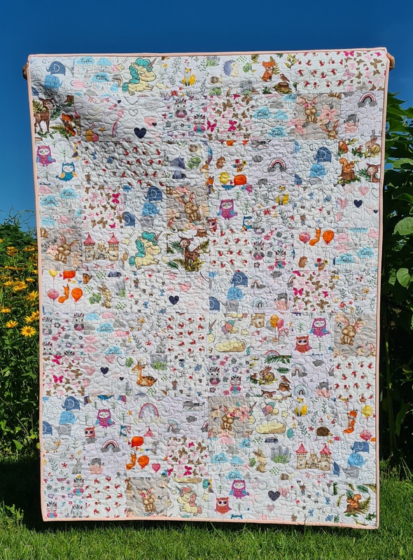 Für eine Freundin habe ich zwei Decken gequiltet. Sie nähte die Tops und stellte das Material. Alles was ich machen musste war, das Quilten. Eine Mädchendecke und eine für Jungs. Ich habe das klassische meandernde Muster gewählt, da es keine Wünsche oder Vorlieben gab. Bei der blauen Decke wollte ich erst mit blau quilten. Musste dann aber trennen und habe wie bei der oberen Decke beige gewählt. Das Blau war dann doch zu aufdringlich. So ist der Fokus auf den Motiven.