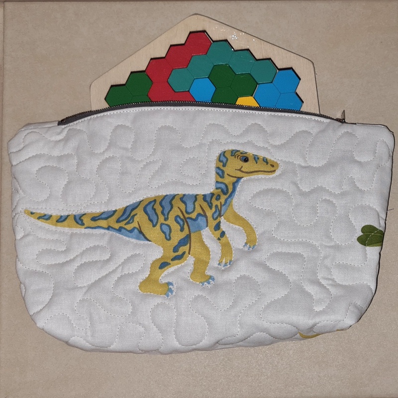 Kulturtasche mit Dinosauier und einem Holzpuzzle, das raus guckt.