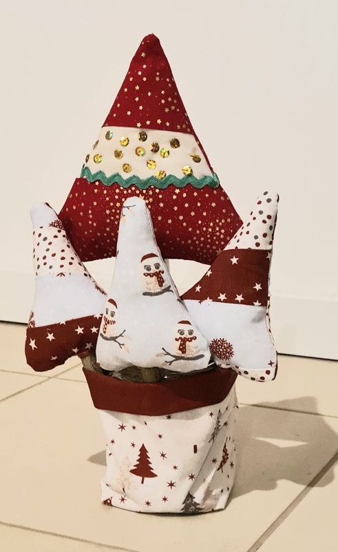 Im Vorfeld hatte ich die kleinen Bäumchen, die Ihr auf dem unteren Foto seht vorbereitet. Sie mussten nur noch genäht, gefüllt und geschlossen werden. Natürlich durften sie auch verziert werden. Der etwas größere Baum hat sich unter die kleineren gemischt. Nun ist dies unser erster Weihnachtsschmuck.