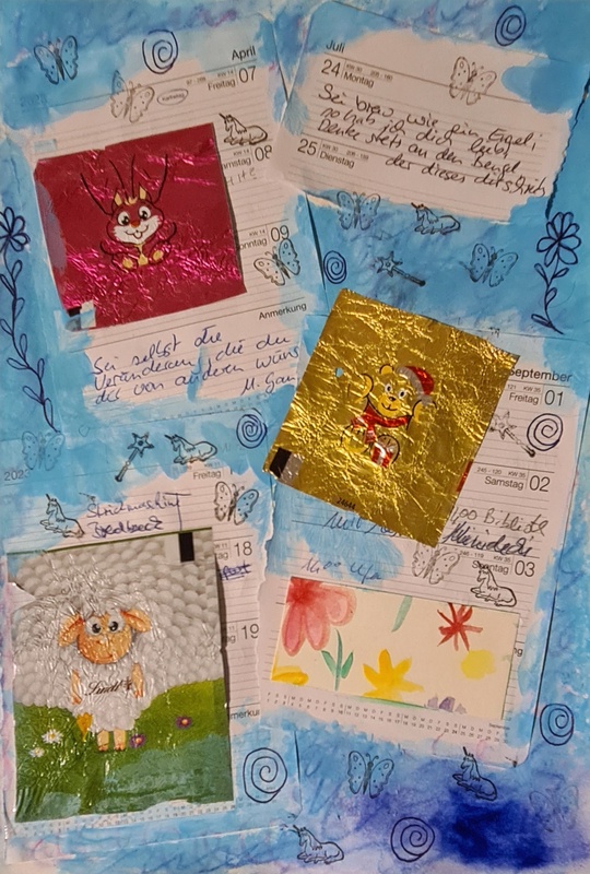 In January, everything related to the calendar can be used, edited and designed. I tore out some pages from my old calendar that I had decorated last year with chocolate wrapping paper and a snippet of a picture. I had already written the quotes on the pages last year. I really like to do that when I find a quote. It makes the calendar more personal and I don't have appointments on every page. A Christmas bear has been added to the picture, so that the Easter animals aren't so lonely.