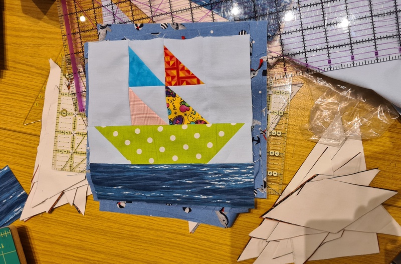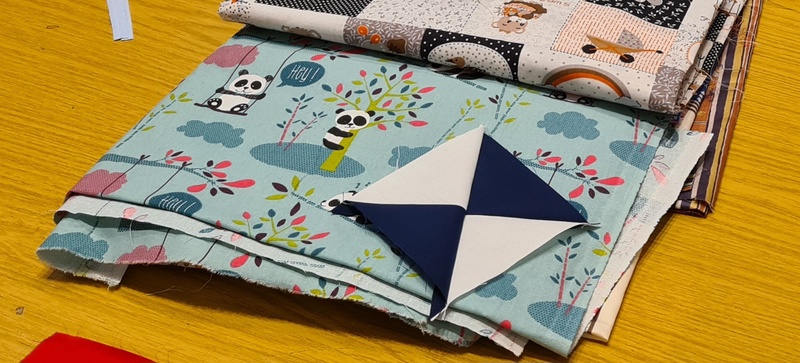Wir hatten vorgenähte Blöcke in einer Schnellnähtechnik bekommen. Diese haben wir geschnitten und viele weitere Blöcke genäht. Ich durfte nähen R. hat die Linien gezeichnet und dann wurden die nähte von wieder jemand anderem gebügelt. Eine großartige Arbeitsteilung. So ist ein beachtlicher Berg entstanden. Später sollen die Blöcke mit einem Pandastoff kombiniert werden.