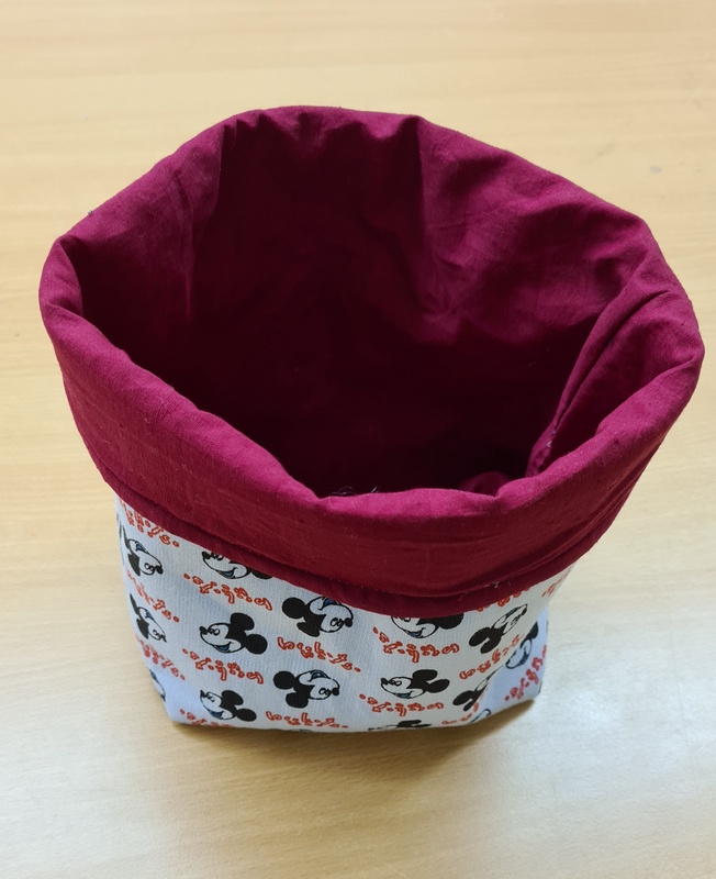 In dieser Woche habe ich ein Utensilio genäht. Die Stoffmaße sind 60x30 cm und die Ecken, die für den Boden rausgenäht wurden 6x6 cm.
