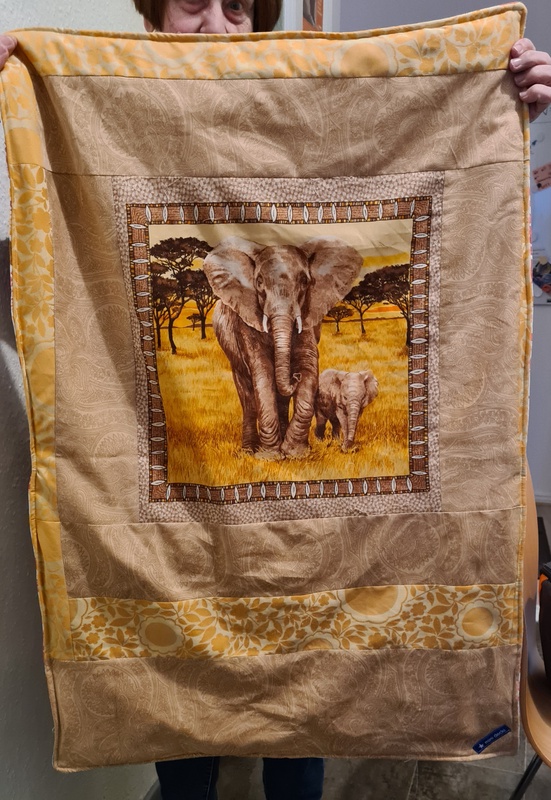 Und zuletzt möchte ich die zwei Decken zeigen, die ich gestern beim Minideckinähen zuendegenäht habe. Ich hatte Elefantenpanele bekommen, die ich jeweils zu einem Top verarbeitet habe.