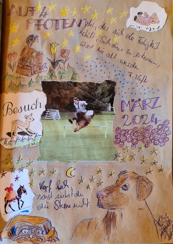 Im Monat März ist das Thema bei ArtJournalJourney "Auf allen Vieren". Ich habe den Titel auf meiner Seite auf "Auf 4 Pfoten" geändert. Nachdem ich es im letzten Monat nicht geschafft habe teil zu nehmen gibt es in diesem Monat eine gedoodelte Seite mit Zeitschriften- und Buch-Elementen. Der Hintergrund ist eine Papier-Einkaufstüte.