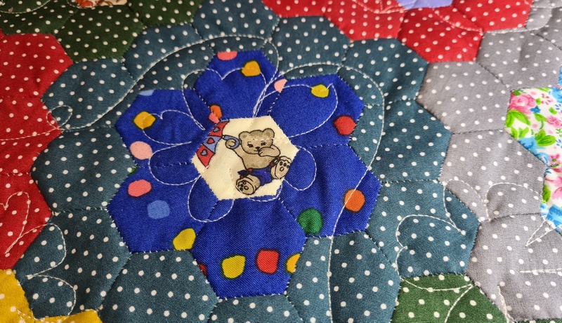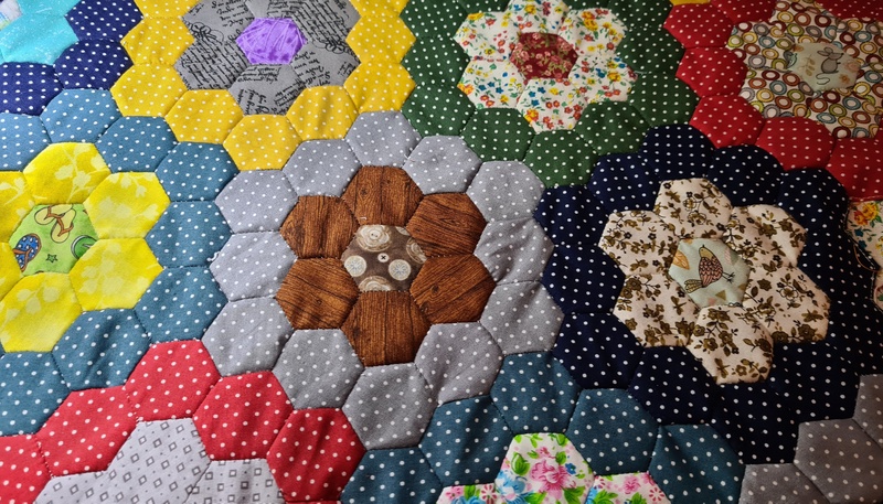 Zu guterletzt kann ich Euch Fortschritte von meinem HexiFlowerSAL-Quilt zeigen.