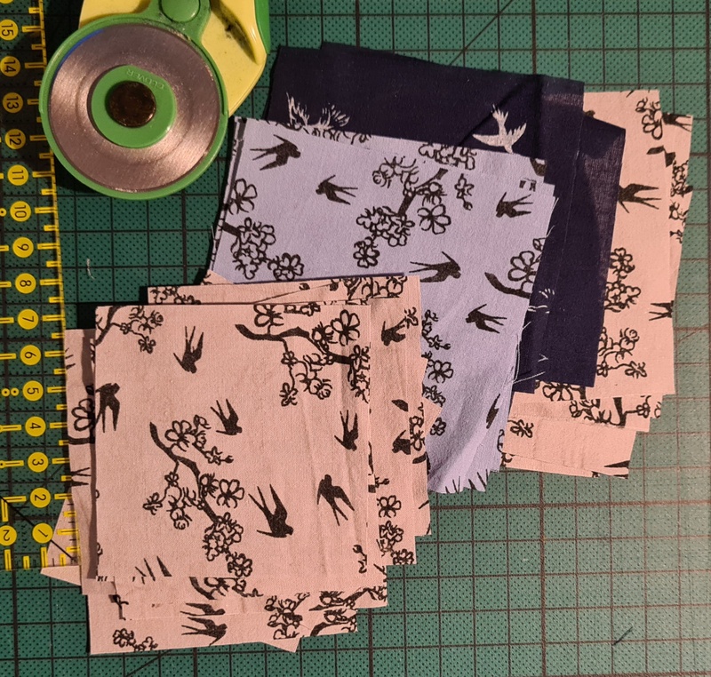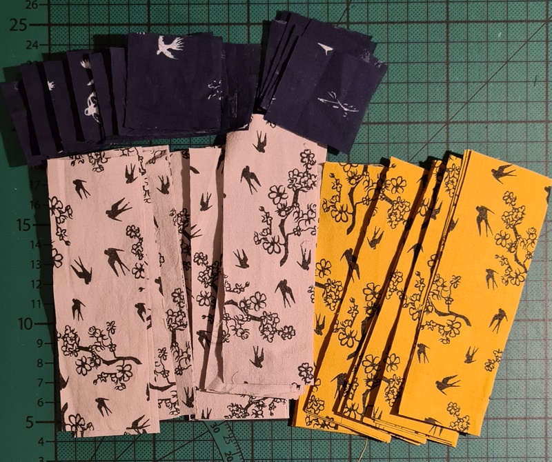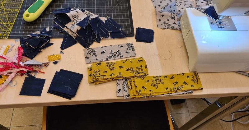 Zuerst wurde zugeschnitten.Ich habe für drei Monate zugeschnitten.Da ich einen rechteckigen Quilt nähen möchte, habe ich 12 statt 10 Blöcke, wie es empfohlen wird geplant.Heute haben wir uns zum gemeinsamen Nähen getroffen und ich habe losgelegt.