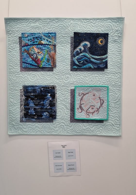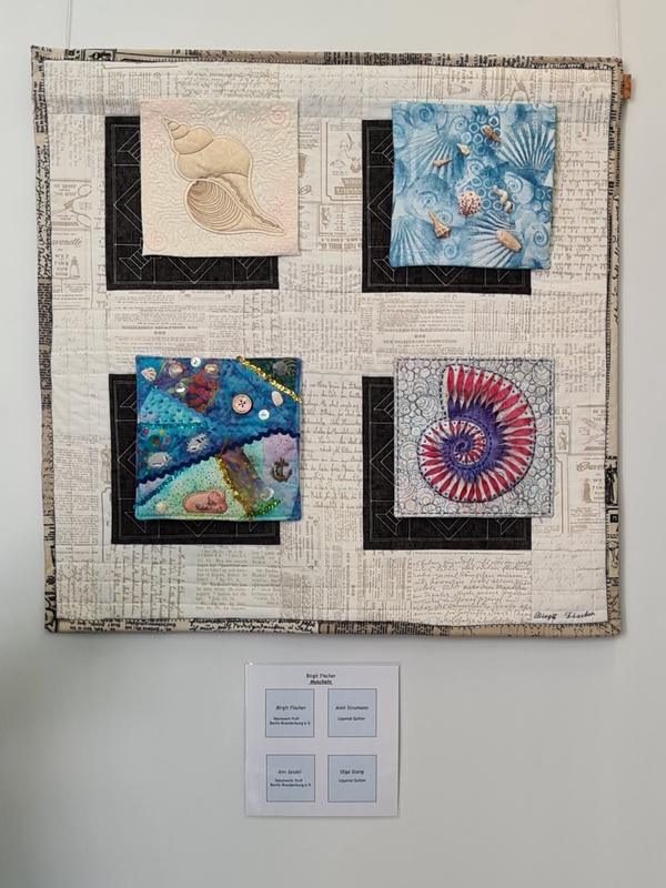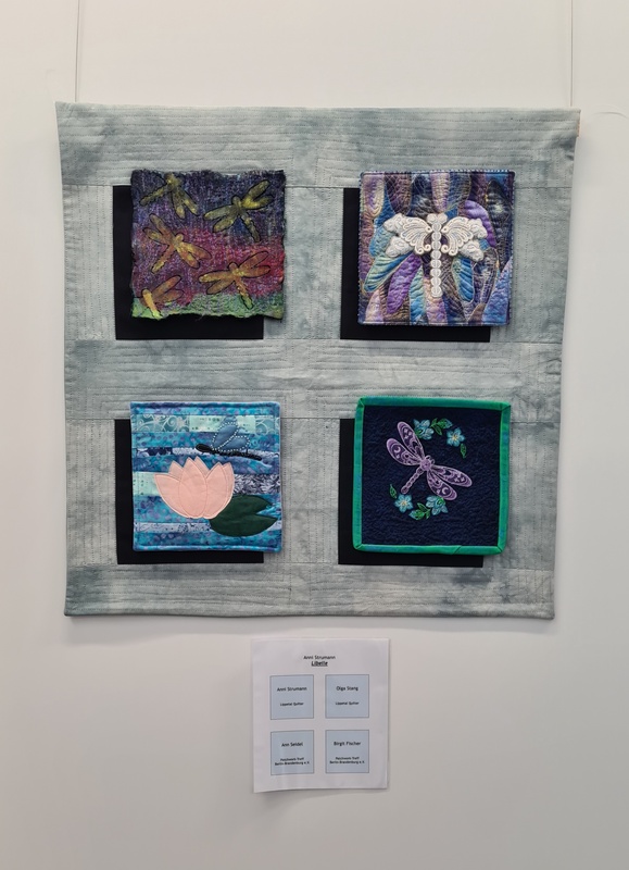 In der Ausstellung Quiltgeheimnis Berlin und Lippetal war meine Pinnwand und vier meiner Quadrate zu sehen. Es ist ein Tauschprojekt, bei dem jede von uns sich ein Thema wünschen durfte. Dieses Thema wurde an drei Frauen gegeben, die für einen ein Quadrat gestalteten. Ein Quadrat nähte ich selbst. Mein Thema lautet "Du musst mit Allem rechnen auch mit dem Schönen".