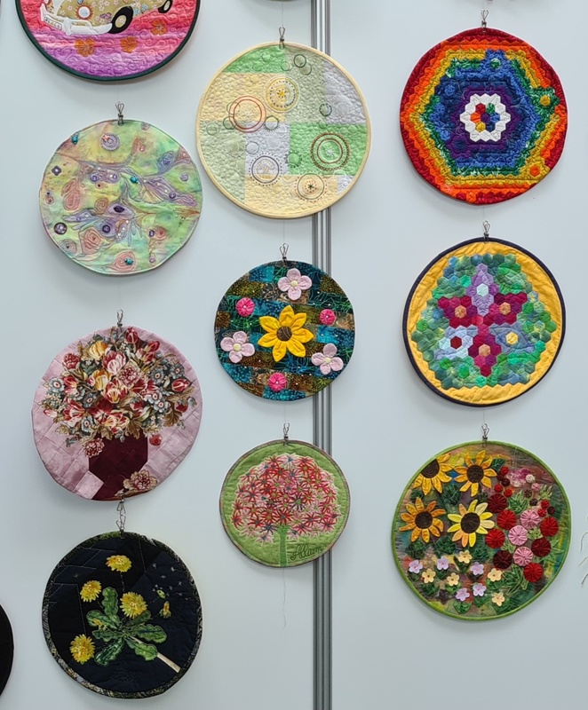 In der Ausstellung Flower Power hing mein runder Blumenquilt. Auf dem Foto ist es der Quilt in der Mitte.