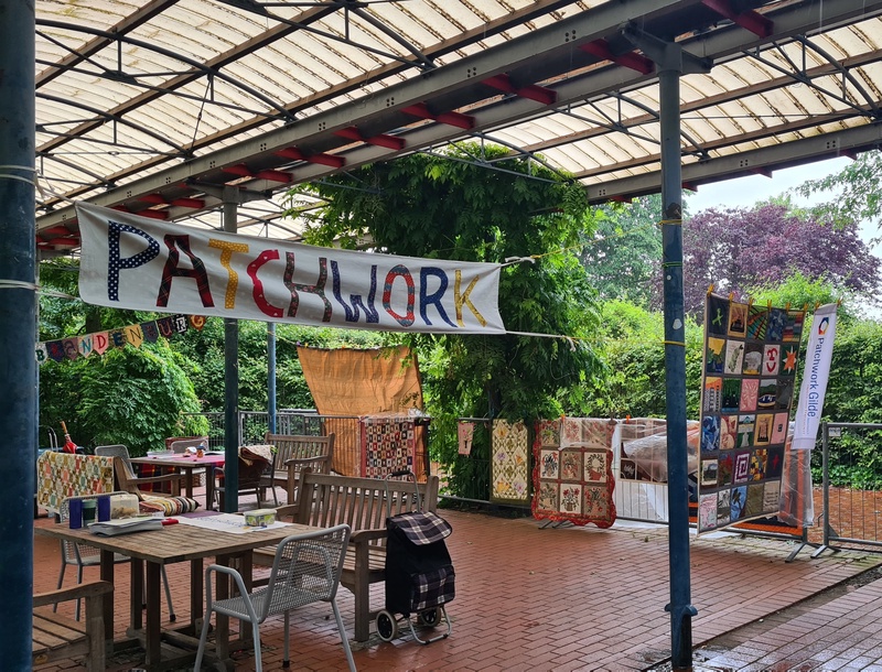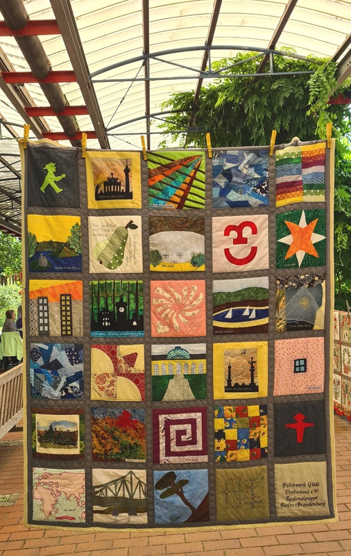 Am 15. Juni war Quip-Day: Quilting in Public. Wir haben vom Patchwork-Treff Berlin-Brandenburg aus, zusammen mit der Gilde daran teilgenommen. Wir trafen uns im Britzer Garten. Morgens hatte es das Wetter nicht so gut gemeint. Da wir jedoch einen überdachten Platz hatten, konnte uns das Wetter nichts anhaben.