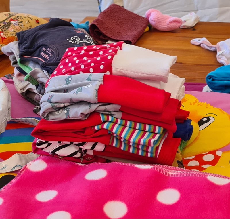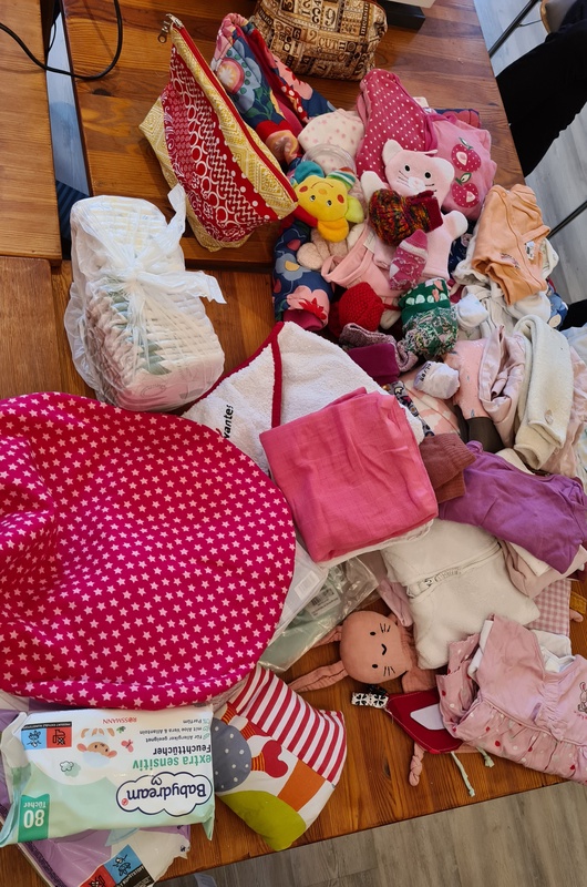 B. berichtete, dass sie pro Woche 25 Taschen packen. Das sind im Jahr 1200 Stück. Diese Taschen gehen an bedürftige Mütter. Wer eine Tasche bekommt wird von Personen bestimmt, die im sozialen Bereich arbeiten. Wie eine Mutter in so eine Lage kommt, kann man sich fast nicht vorstellen. Es sind Frauen, die durch unser soziales Netz fallen und nichts haben. Die Tasche ist sozusagen ein Starterpaket und enthält die Ausstattung (Kleidung) für das Kind für ein Jahr.