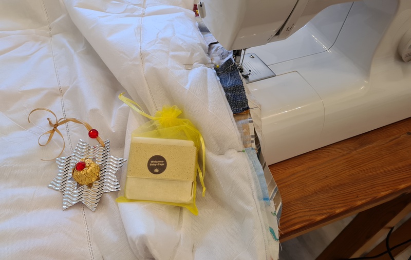 B. brachte uns eine Tasche mit, um uns zu zeigen, was dort alles hineingepackt wird und wo unsere Decken landen. In eine Tasche werden 42 Teile eingepackt. Ein Teil davon sind unsere Minideckis.