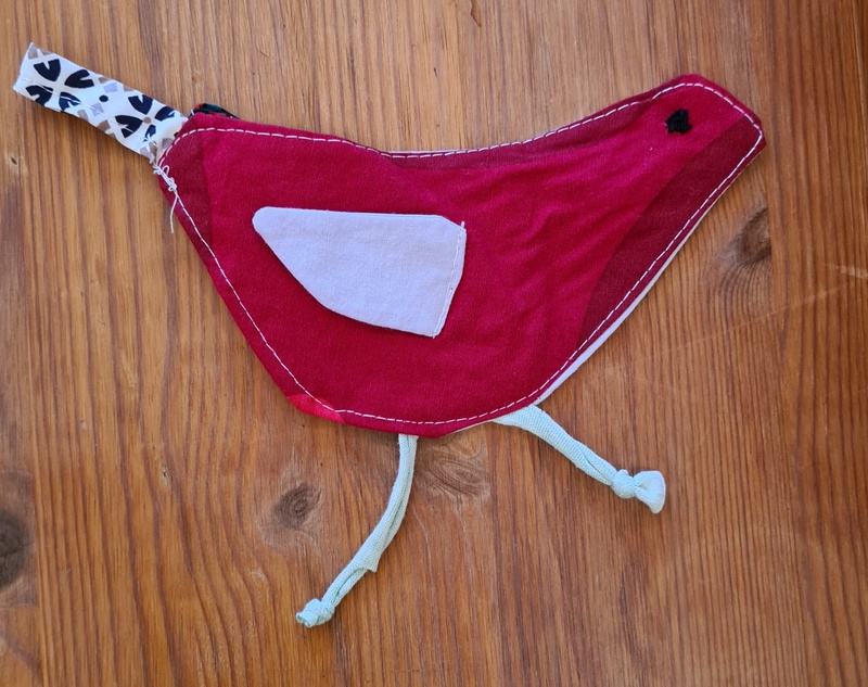 Besonders gefallen hat mir dieser Vogel. Er enthält ein Knistermaterial. Wurde er nach einer Kinderzeichnung genäht?