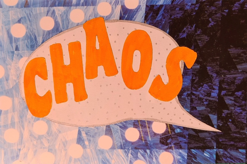 In dieser Woche werden beim Mittwochsmix die Wörter Chaos und Popart gemixt. Mein "Design" zeigt eine Sprechblase mit dem Wort Chaos. Typisch für Popart sind u.a. Punkte, Sprechblasen und Worte, die man aus Commics kennt. Dessen habe ich mich bedient.