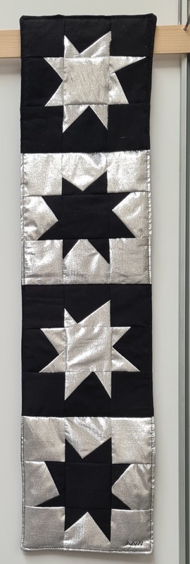 Der nächste Quilt, wurde für die Ausschreibung "Von Moers nach Goslar" angefertigt. Da beide Städte in der Vergangenheit mit dem Bergbau in Verbindung standen, sollte der Quilt silber und schwarz sein. Der Quilt sollte eine Geschichte erzählen oder nur die Kontraste darstellen. Ich habe mich für die Kontraste entschieden. Der Bergbau war die Hoffnung der Städte und Sterne stehen auch für die Hoffnung. So entstand der zuvor gezeigte kleine Quilt (15x30 cm)